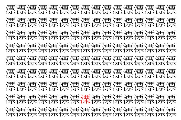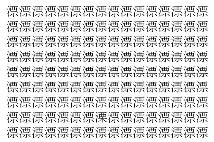 画像の中には、「漂」という漢字が縦に9行、横に16個並んでいます。 全部で144個となりますが・・・、そのうち1つは「異なる漢字」となってますよ!!