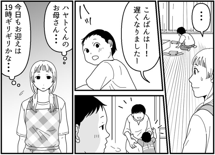 私(アンナ)は保育士をしています。昔から子どもに関わる仕事がしたくて、この職業を選んで2年目になります。1年目は慣れなくて毎日がてんやわんやでしたが、2年目になった今年はようやくいろいろ見えてくるようになりました。大変なことも多いけれど、可愛い子どもたちに囲まれた職場で充実した日々を送っています。そんななか、気になっているのがハヤトくん(3歳)。お母さんのお迎えが遅く、毎日ひとりだけ19時まで残っているのです……。