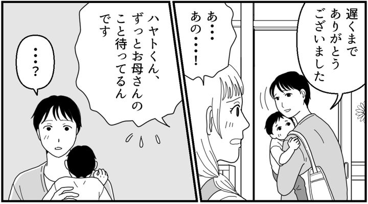 ハヤトくんはいつも誰かの声がするたびパッと顔を上げ、別の子のお迎えだと分かるとうつむいて寂しそうな顔をしています。半べそのハヤトくんを抱きあげ、荷物を持って帰ろうとするお母さんに、私は思わず声をかけました。
