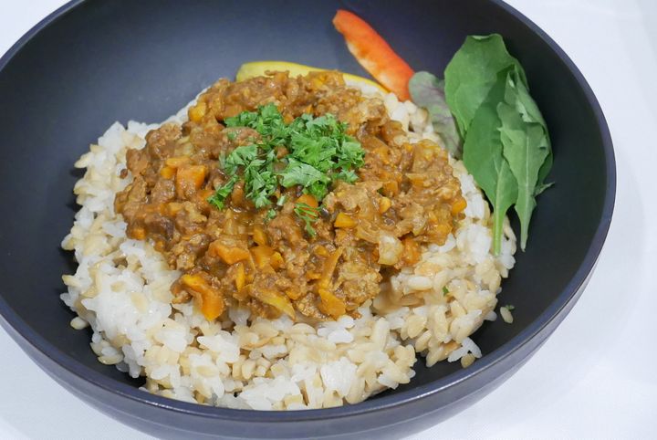 「本炭釜 紬」ではこのダイズライスを美味しく炊ける「ダイズライスモード」を搭載しているんです!白米と1対1で混ぜて炊くと、1食(150g)あたりのタンパク質が約218%アップ、糖質が約43%カットすることができ、お米を楽しみながら無理なく取り入れられます。また、カレーなどと組み合わせると美味しく食べられますよ。
