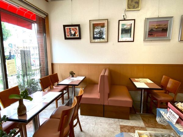 西口店と東口店がありますが、西口店はケーキや焼き菓子が並ぶ店内の奥に、12席の喫茶コーナーがあります。