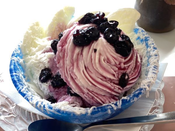 「チーズケーキ氷(ブルーベリーシロップ)」600円(持ち帰りは648円)