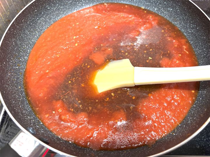 少し煮詰めたら、めんつゆを加えて混ぜて火を止めます。