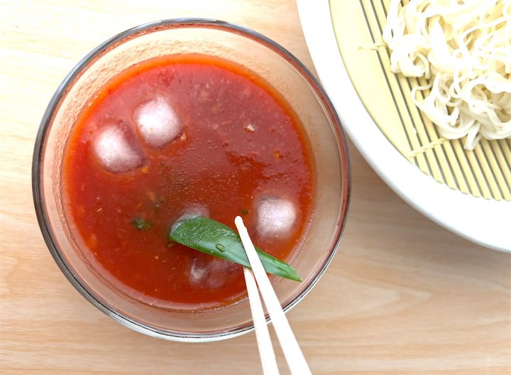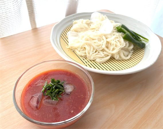 今回の「トマトつけ麺」は、そうめんで食べますが、サラダ用のスパゲティで冷製パスタのように食べるのもおすすめだとか!
