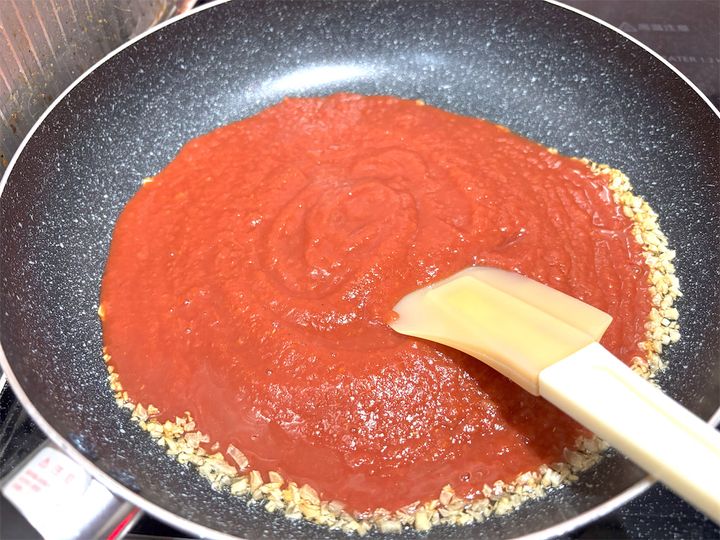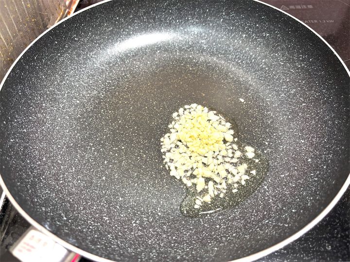 フライパンにオリーブオイルとにんにくを入れてから、火をつけて中火(IHクッキングヒーターだと160℃くらい)でよく炒めます。