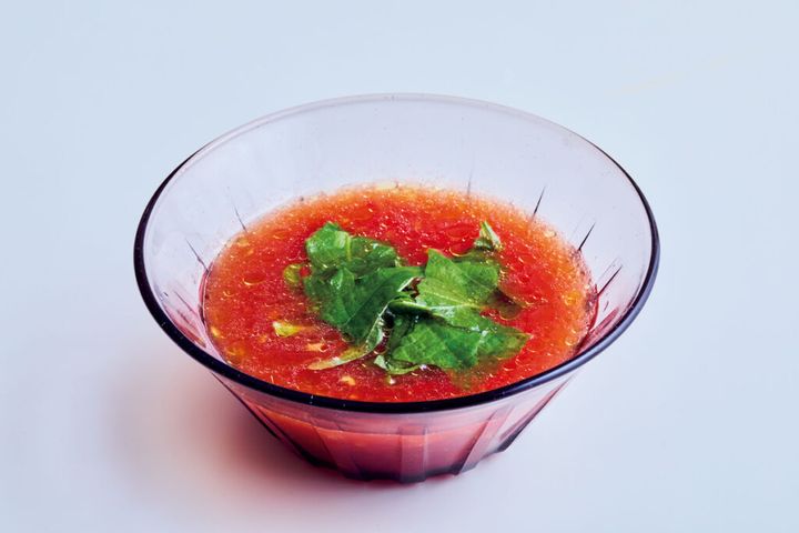 (1)ボールにトマトをすりおろし、〈A〉を加えて混ぜる。器に盛り、青じそをちぎってのせる。