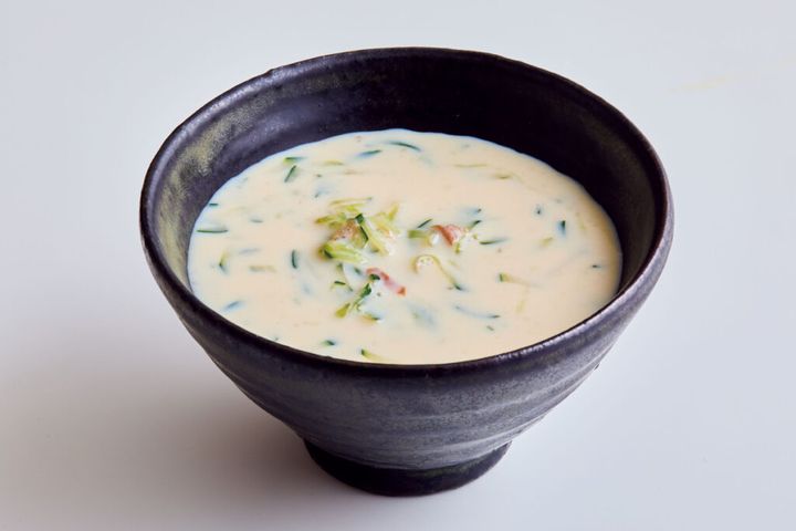 (1)梅干しは種を取って果肉を包丁でたたく。きゅうりは長さ4cmのせん切りにする。ともにボールに入れ、豆乳、めんつゆを加えてよく混ぜる。