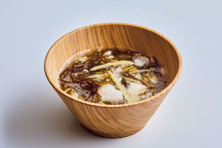 (2)ボールに長いも、もずく、めんつゆを入れて混ぜる。器に盛り、しょうがを加える。