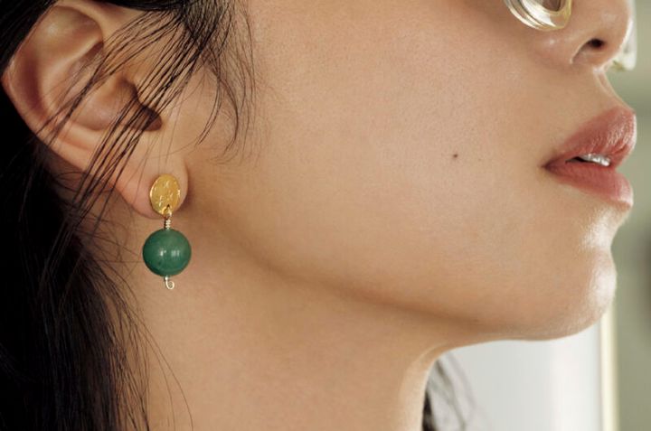 天然石が揺れるピアスは、ラインで魅せるモードなチョーカーを組み合わせ、甘さとクールさのミクスチャーを楽しんで。ダブルフィンガーリングは、アートピースのようなエッジの効いたデザインが斬新。Tシャツ¥990(無印良品/無印良品 銀座) サングラス¥9,900(ローム) ストーンピアス¥15,400(メルセデス・サラザール/ズットホリック) ダブルフィンガーリング¥15,400(ソワリー) チョーカー¥35,200(エテ ビジュー)