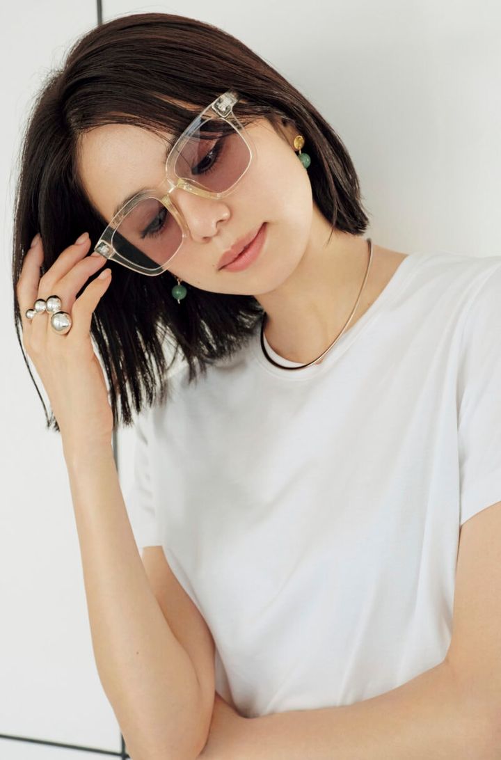 クリアフレームのサングラスなので、耳元には色を差してアクセントに。ダブルフィンガーリングで今っぽく。