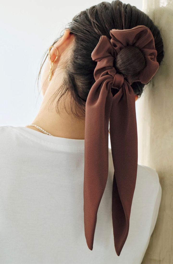 長く垂れたリボンが可愛いシュシュを軸にコーデ。主役が引き立つよう、耳元と首元は華奢なアクセを選んで。