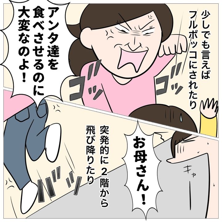 子どもに暴力を振るうだけで過激なナオさんの母ですが、突発的に2階から飛び降りることもあるとは…。