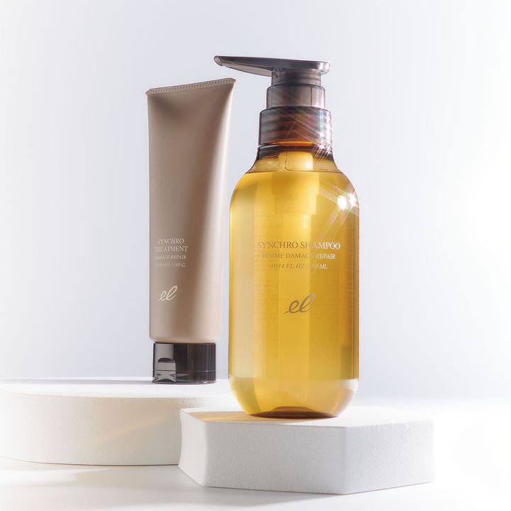 左:ドライヤーの熱に反応してシールド膜を形成。毛髪保護と補修成分の流失をブロック。シンクロ トリートメント ダメージリペア 180g ¥3,080、右:毛髪補修成分で空洞化したダメージ毛にもアプローチ。頭皮のバリア機能もサポート。シンクロシャンプー ファム ダメージリペア 300ml ¥3,740(ともにGMコーポレーション)