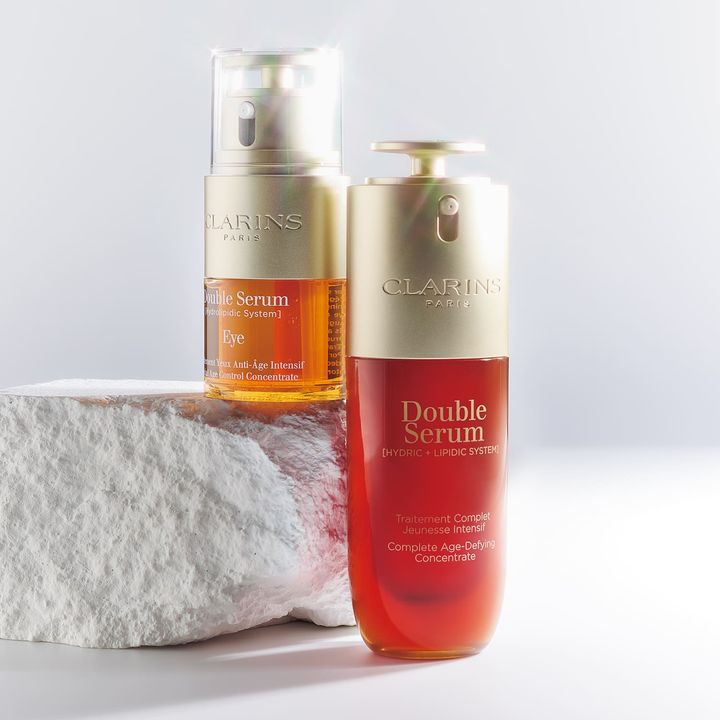 左:目元の保湿のために選び抜かれた13種の植物エキスを配合。スッと馴染んでふっくらとなめらかな目元印象に。ダブル セーラム アイ 20ml ¥10,230、右:水相と油相7:3の黄金比ブレンドが肌の奥深くまで素早く浸透。肌ストレスを跳ね返す肌へ。ダブル セーラム ADC 50ml ¥17,380(ともにクラランス)