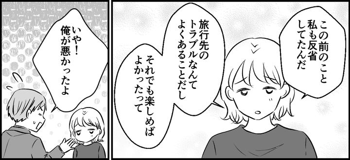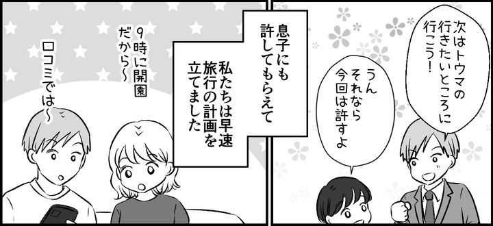 旦那の考えがわかり、私の気持ちもほどけていきました。しばらく気まずかった私たちの間に、ようやく温かい空気が流れはじめました。そして、どこから話を聞いていたのかはわかりませんが、息子がドアの隙間から声をかけてきました。私たちの計画性のなさを息子にも指摘されて夫婦で反省。息子にリベンジを約束! 私たちは旅行のやり直しをすることにしました。