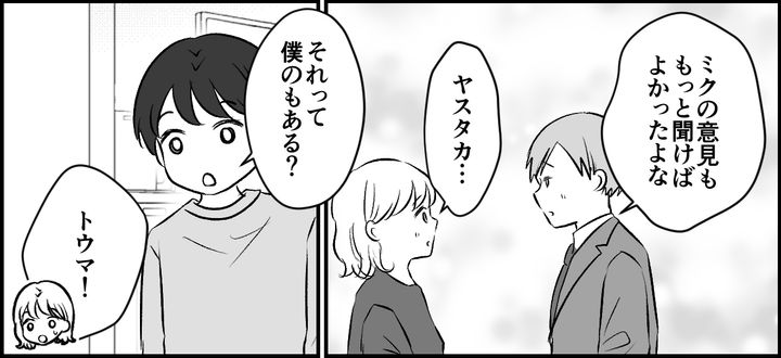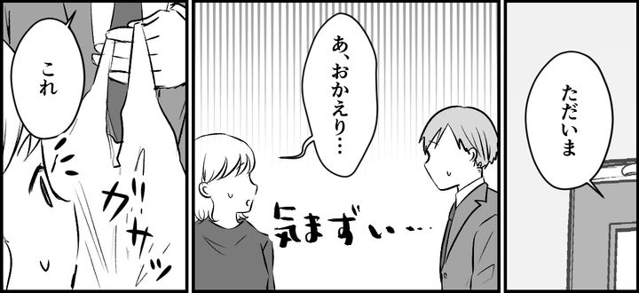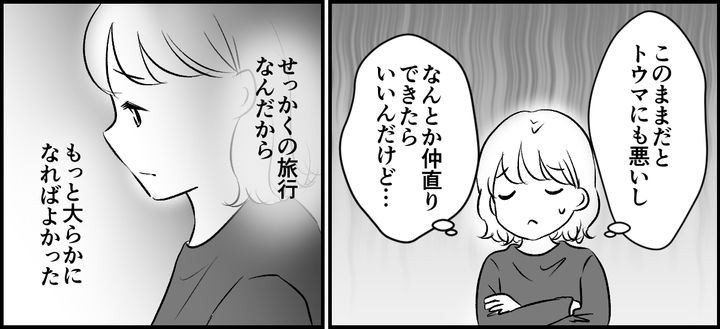 旅行から帰ってきてからもずっと旦那と気まずい状況が続いていました。こんなんじゃイヤ。トウマにも悪いし、なんとか仲直りできたらいいんだけどな……と反省しているところに旦那が帰ってきました。