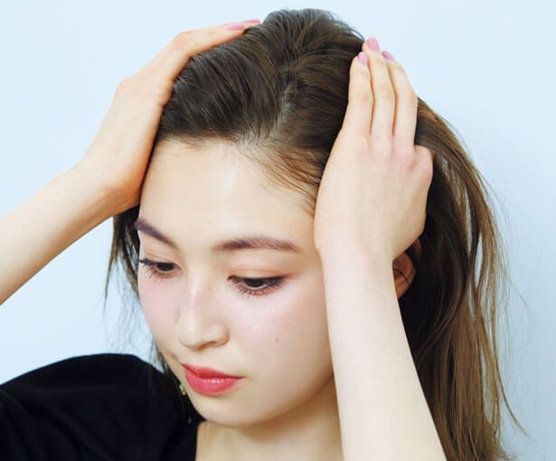 8:2くらいになるように、小指を差し入れ分け目を立ち上げるようにして作る。コームで分けると綺麗になりすぎるのでNG。