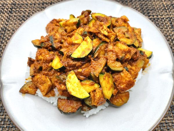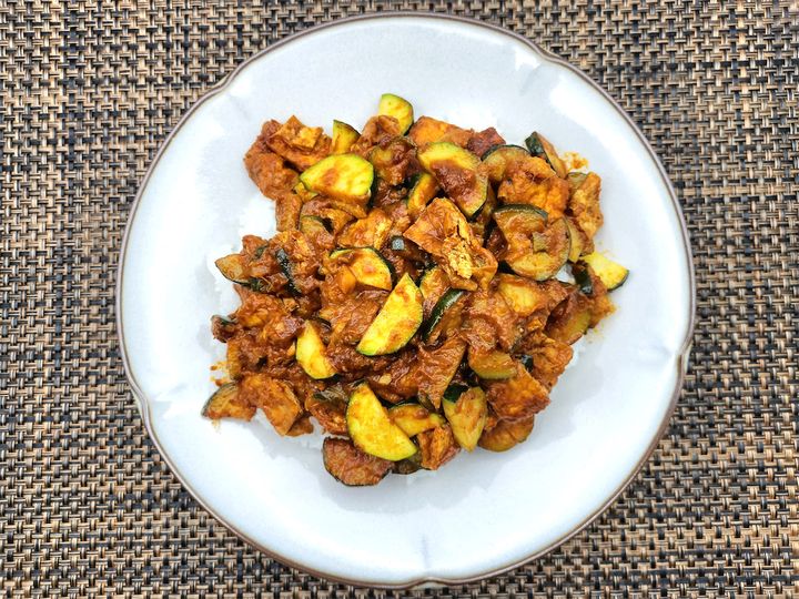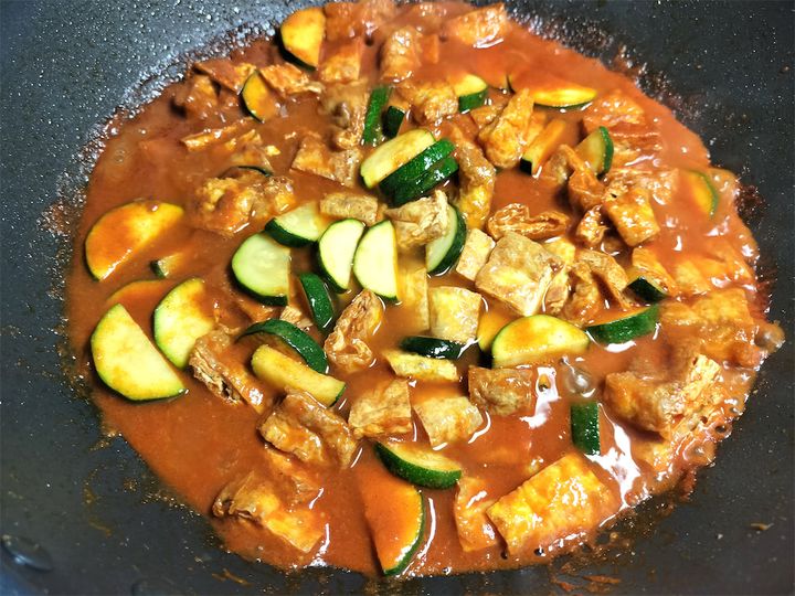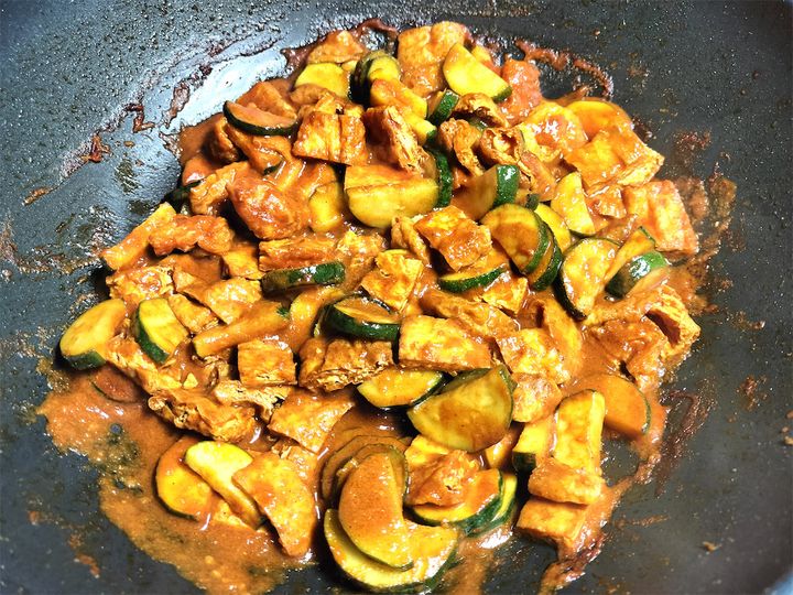にんにく、しょうが、カレー粉、チリパウダーを炒めている時点では、疑いもなく「これはカレーだ」と思っていました。ところが、ズッキーニと油揚げを入れたあたりから、なんとなくいつものカレーとはだいぶ様子が違ってきたのです。