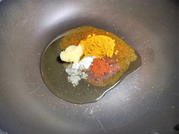 1. フライパンを強火にかけ、こめ油をひき、にんにく、しょうが、カレー粉、チリパウダー、塩を加え、油が熱くなってきたら中火にしてよく炒めます。