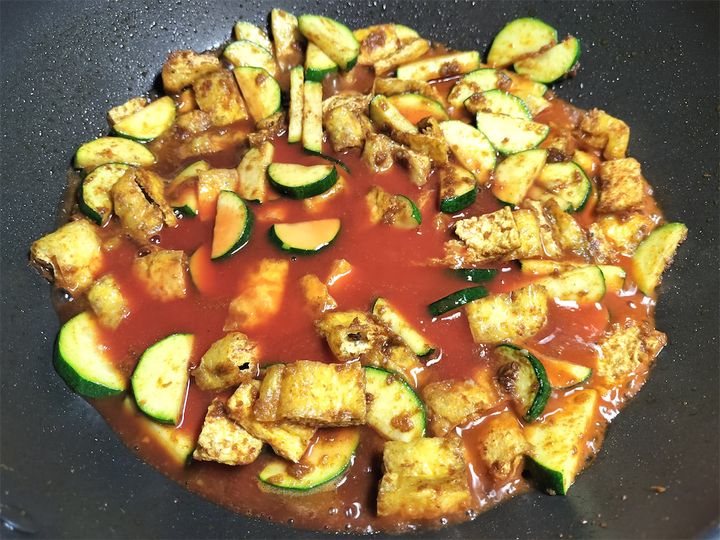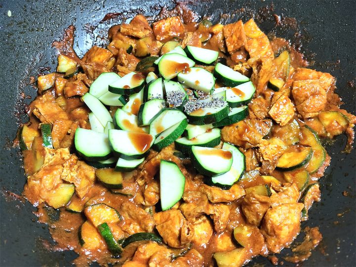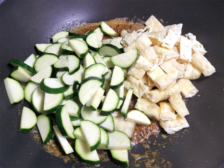 2. ズッキーニ2/3と油揚げを加えてよく炒めます。