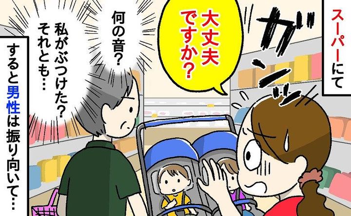 「ガンッ」スーパーで買い物中、衝撃音が。ベビーカーがぶつかった?念のため近くの男性に声をかけると!?