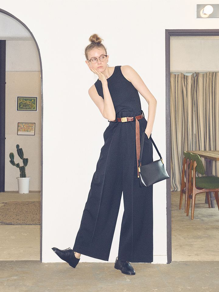 メンズパンツを新投入。ベルトできゅっとしぼることで立体感が増し、それだけで存在感のあるシルエットが出来上がり。ウィメンズのワイドパンツよりボリュームが出るため、ベーシックな黒だけで絵になる。締まったウエストとふくらんだパンツラインにより、上半身の細見せに成功。同時に黒合わせの間のびも回避。 黒ワイドパンツ(メンズ) /STERNBERG(アダストリア)