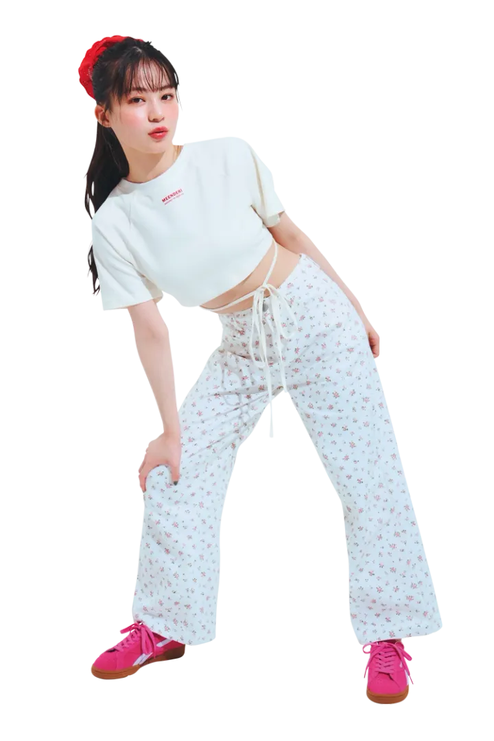 レースアップショートTシャツ 10,030円/MEENDERI(HANA KOREA)小花柄デニムパンツ 3,280円/神戸レタス シュシュ 2,970円/アネモネ(サンポークリエイト)スニーカー 13,200円/Reebok