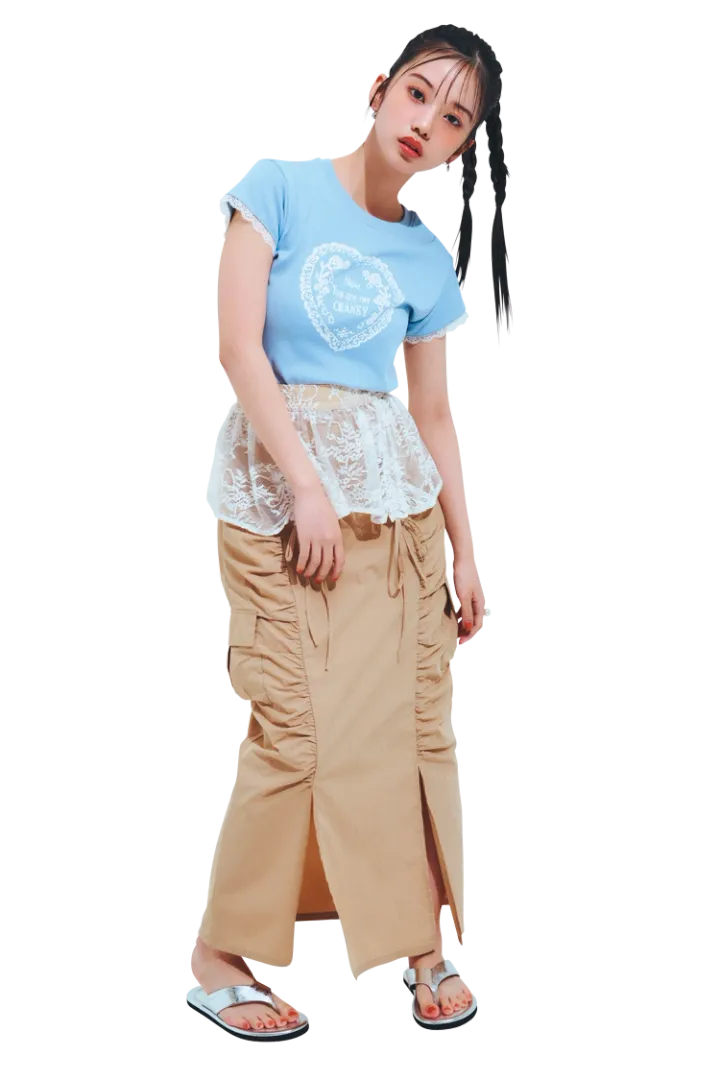 レースハートTシャツ6,410円/CRANK(HANA KOREA)レースベルトつきスカート 14,300円/CALNAMUR イヤリング 2,640円/アネモネ(サンポークリエイト)サンダル 6,900円/チャールズ&キース(チャールズ&キース ジャパン)