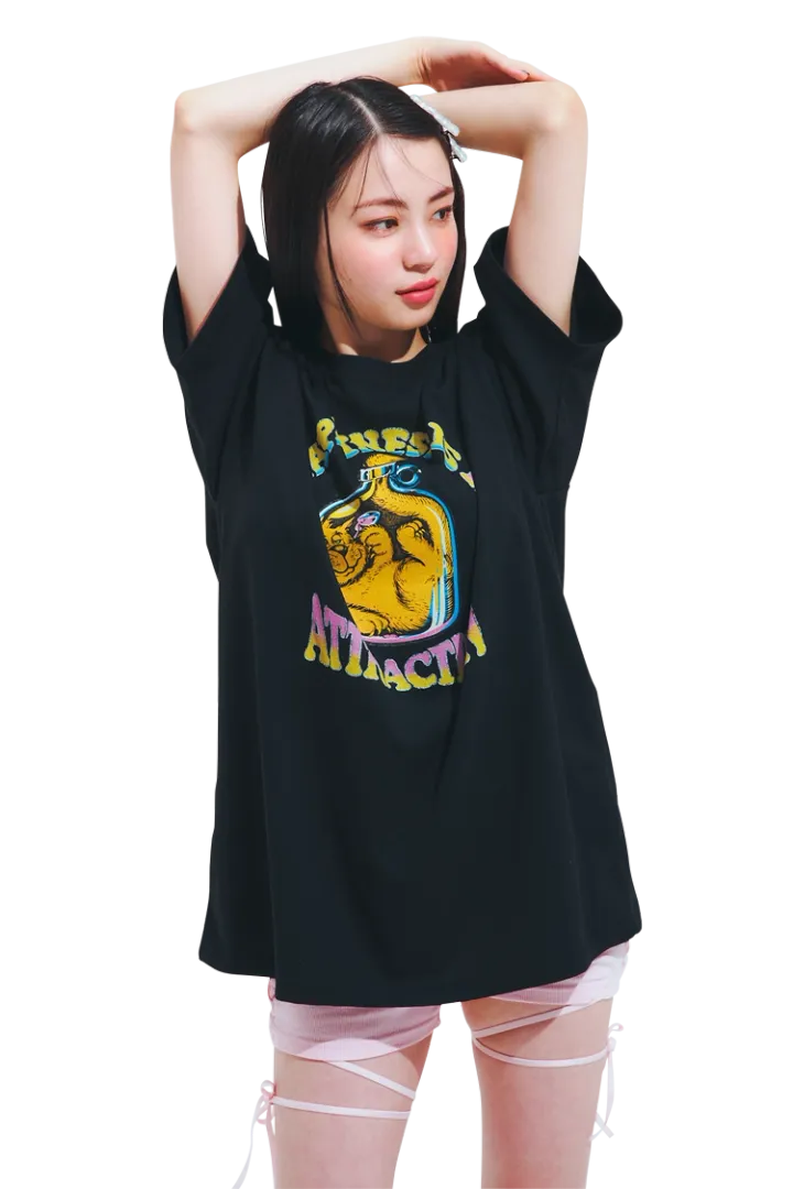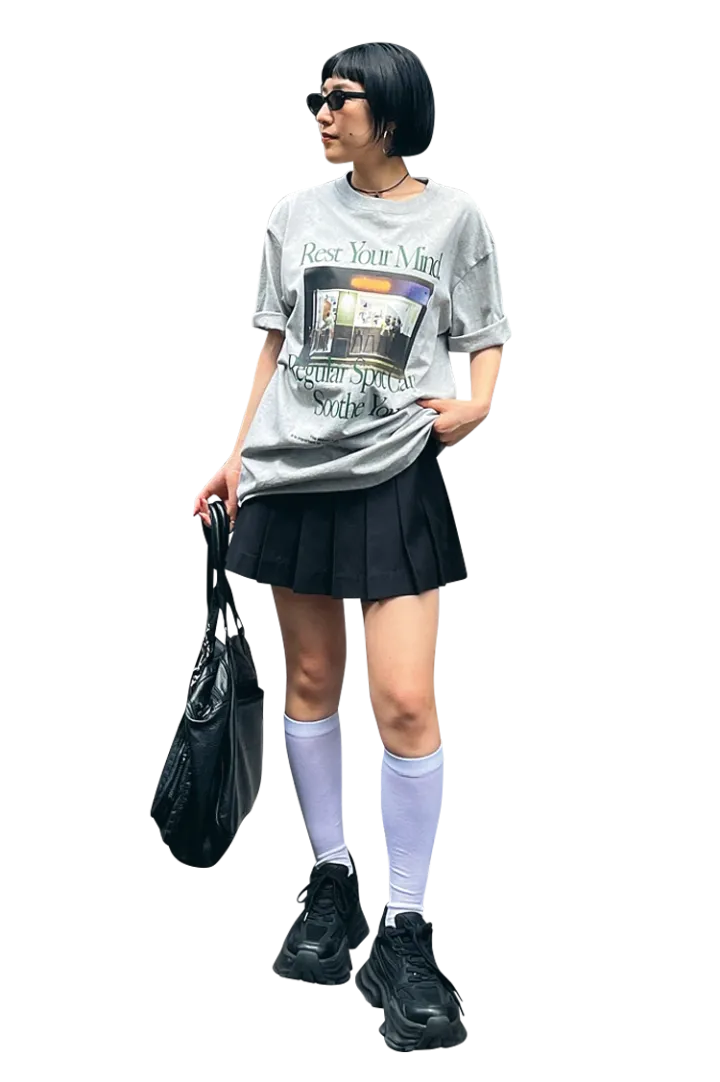 「体型カバーできるダボッとしたTシャツは、がっつり脚を見せさせた方が細見え。シアーのソックスも美脚に導いてくれるポイントです」