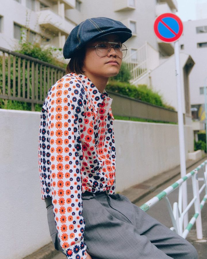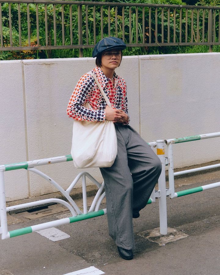 3. 【スナップ】タイトめの柄シャツと太めのトラウザー、そしてキャスケットとメガネが導く懐かしいレトロスタイル