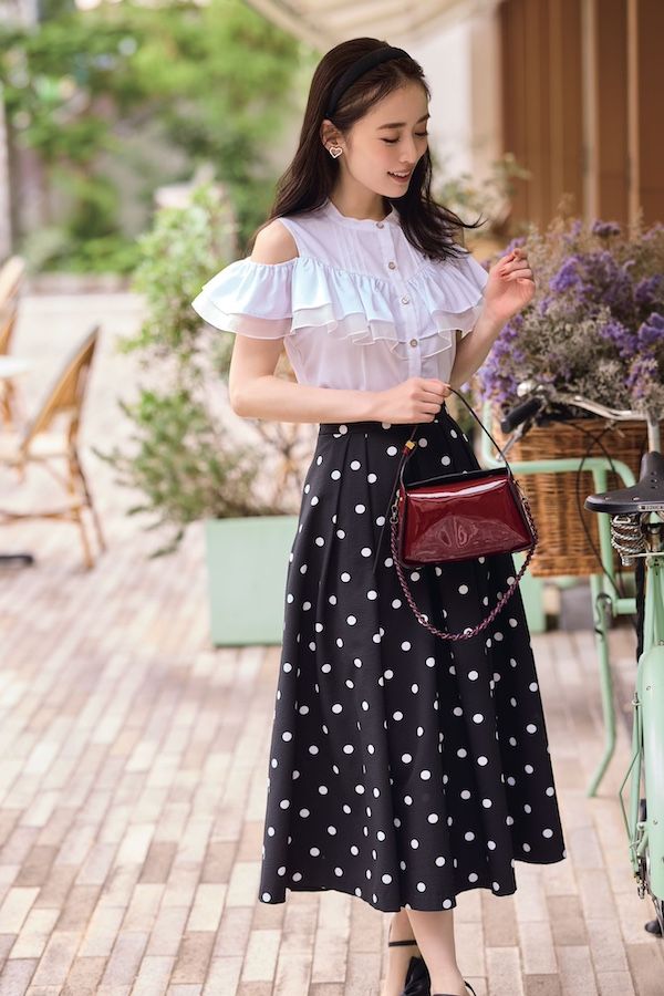 [ブラウスを着回し]スカート¥27,5 00/マーリエ ル カセット(フランドルカスタマーサービス) カチューシャ¥26,400/アレクサンドル ドゥ パリ(アレクサンドル ドゥ パリ GINZA SIX店) イヤリング¥2,090/アネモネ(サンポークリエイト) バッグ¥64,900、チェーン¥9,900/ともにジャンニ キアリーニ(ジャンニ キアリーニ 銀座店) 靴¥10,890/RANDA