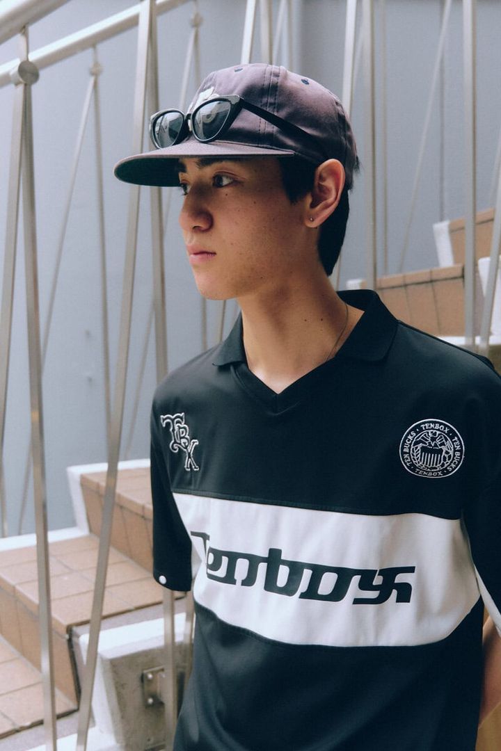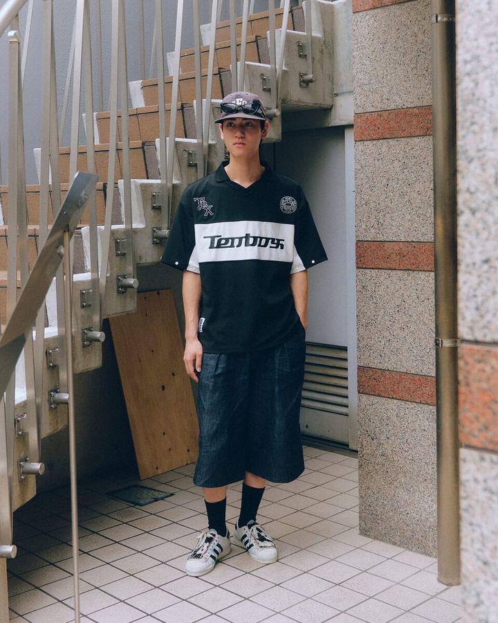 今日の着こなしポイント:スポーツをファッション的に解釈してみた部分。ゲームシャツがサッカーユニフォームであることにちなみ、アディダスのスニーカーを選択。ショーツ、帽子、サングラスなどを合わせてスポーティなスタイリングの中にも、シルエットやアイテムでファッション性のある雰囲気を演出。