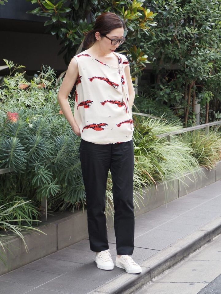 コーディネートの主役は、パリで活躍していたデザイナー・デヴィッド ツェトが手掛けたシルクブラウス。キャッチ―なプリントながら、落ち着いた地色と上質なとろみ素材で、大人の装いにマッチ。アシンメトリーなネックラインも特徴的で、1枚で華やかさを演出。「ボトムは細身のテーパードパンツを選び、動きやすく日常生活に合うスタイリングにまとめました」