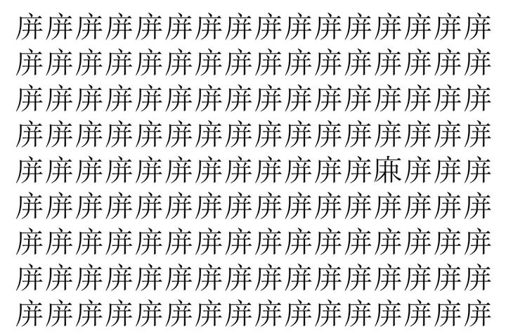画像の中には、「庰」という漢字が縦に9行、横に16個並んでいます。 全部で144個となりますが・・・、そのうち1つは「異なる漢字」となってますよ!!