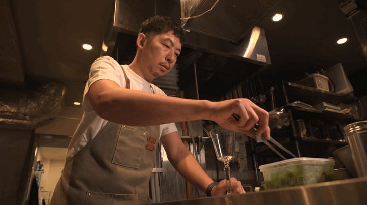 ケーキやアイス、ソースなどさまざまな抹茶を詰め込んだパフェに添えられるのは、甘さ控えめに炊き上げたあんこ。「粒がちゃんと立っていて、噛むとホロホロッと崩れていく。抹茶と合いますね」。隠し味は、日本酒のジュレ。そのスッキリ感がアクセントになり、奥行きのある味わいに。「万博開催中でインバウンドのお客さんも多いので、日本の素晴らしい食材を食べていただいて、日本の素晴らしさをもっと知ってもらいたいなという思いで、このメニューを作りました」と中松さん。