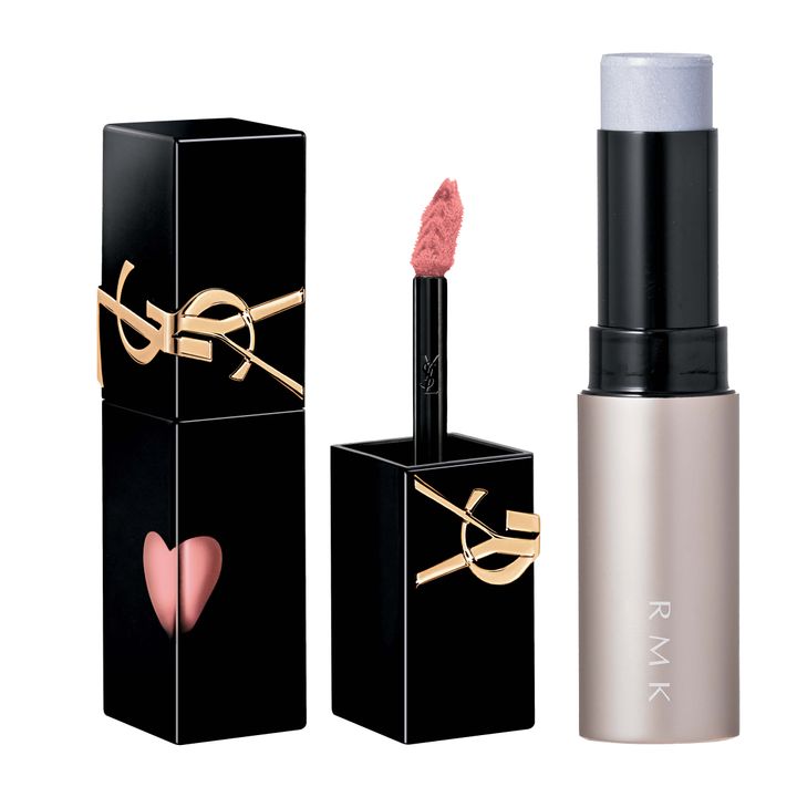 「カバー力とナチュラル感が両立したファンデのグロウ感にチーク、ハイライトが肌に溶け込んで一体化。質感も色味も極めて馴染みやすいリップがニュアンスを作り、表情まで美しく整える」(左)YSL ザ インクス ブラークリーム 44 ¥6,490(イヴ・サンローラン・ボーテ)(右)ラディアントカラースティック 01 ¥3,630(RMK Division)