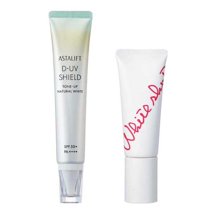 「美白はハリ+透明感の併せ技で作るもの。球体である顔に光を廻して取り込み、それを跳ね返すようなハリ感があってこそ真の透明感ですよね。最新UVケアで、真の美白を追求できるように!」(左)アスタリフトD-UV シールド トーンアップ(ナチュラルホワイト)SPF50+・PA++++ 30g ¥4,290(富士フイルム)(右)ホワイトショット セラムUV[医薬部外品]SPF50+・PA++++ 45g ¥7,150(ポーラ)
