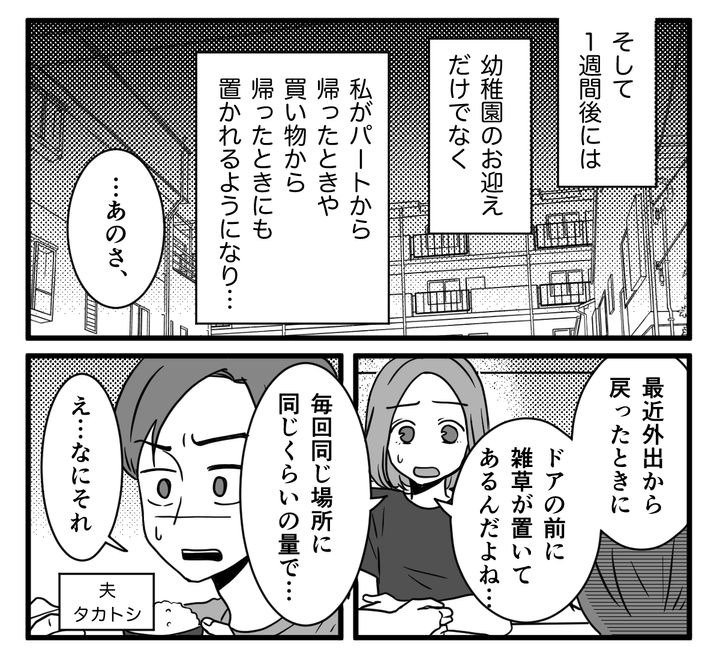 その後も連日、息子のお迎えから帰ると同じように雑草と土が置いてありました。1週間経つと、息子のお迎えのときだけではなく、私がパートから帰ってきたときや買い物から帰ってきたときも雑草と土が置かれるようになったのです。私は気味が悪くて、夫に相談しました。