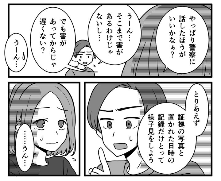 私が夫に相談すると「もう少し様子を見よう。記録しておこう」と提案され、私は証拠を残すことに。突然の嫌がらせに、私は不安が募ります。