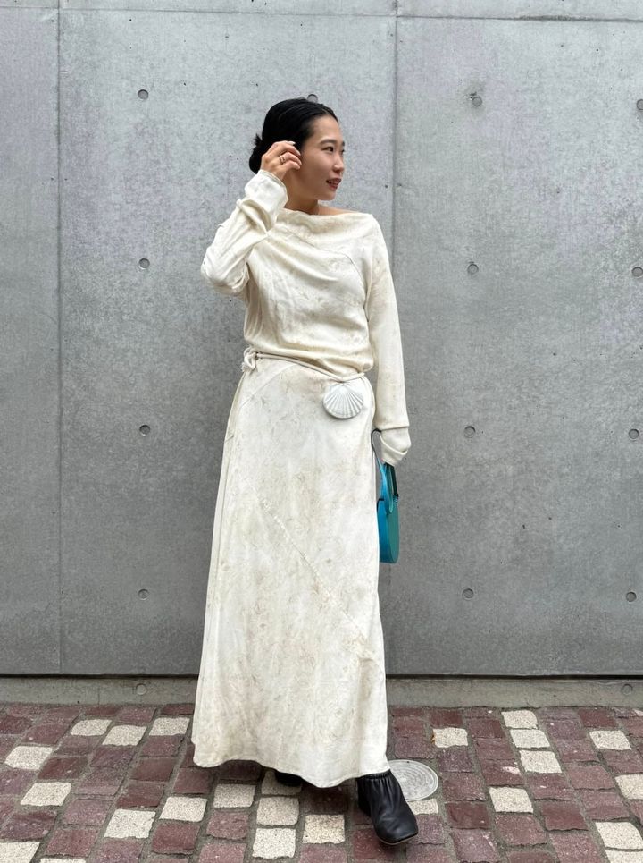「RUOHANのワンピースは友人が手掛けており、日本で最初のお取り扱いを弊社で行った、思い出たくさんのブランドもの。潔く1枚でも素敵ですが、貝殻モチーフのネックレスをベルト風に取り入れてアクセントに。さらにグリーンのバッグでスタイリングを引き締めています」
