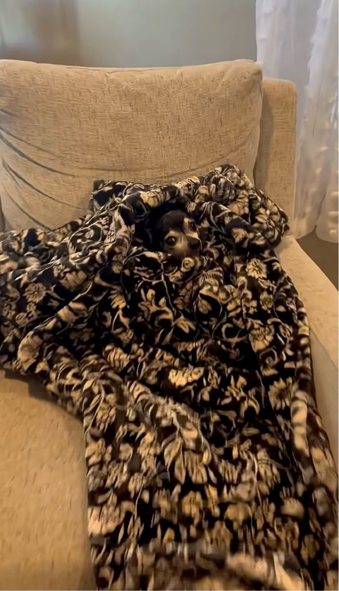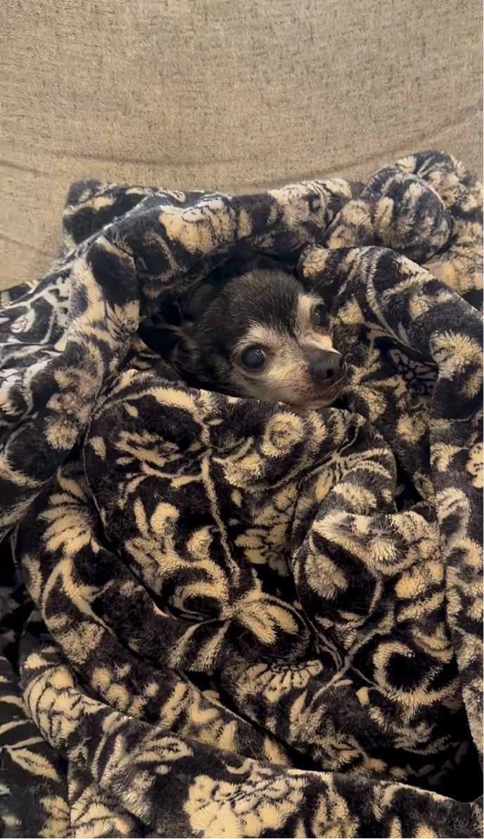 飼い主さんが探し回る中、ブランケットにくるまれてくつろいでいたチワワ。 その時の様子は、こちらの動画からご覧いただけます。