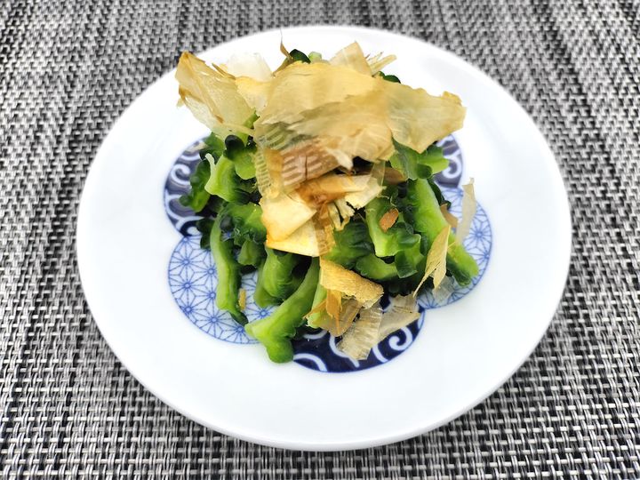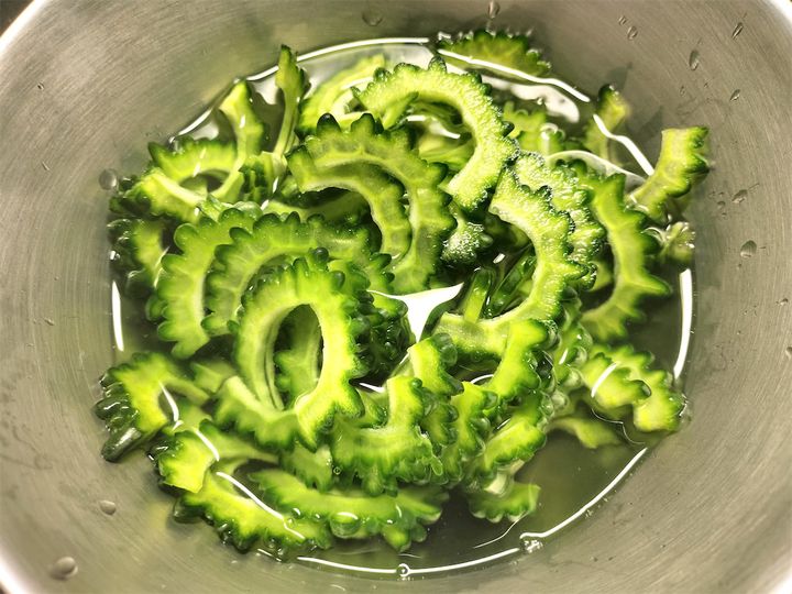 でも、このレシピで紹介していた「沸かしたお湯をかけて、そのまま置いておく」という下処理方法は初めて見ました。しかも、いつもより薄切りにしているので、モモルデシンがより出やすくなっていて、苦味が軽減される効果も十分に期待できそうです。