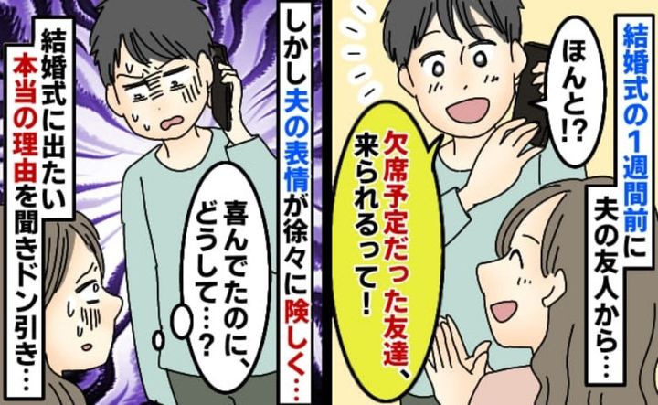 結婚式まであと1週間となったある日、欠席予定だった夫の友人から「やっぱり結婚式に出席したい」と申し出が。喜ぶ夫を見て私もうれしくなっていたのですが、出席したい理由は予想外のもので……!?