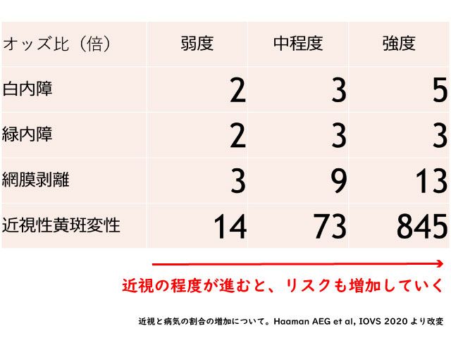 眼鏡をかければ遠くが見えます。それでいいじゃないかと考える方も多いでしょう。実は近視の正体は眼の前後の長さが伸びる状態で、すなわち眼の変形を意味します。眼が変形することで網膜剥離を始め、緑内障、白内障、黄斑変性などのリスクが増加します。