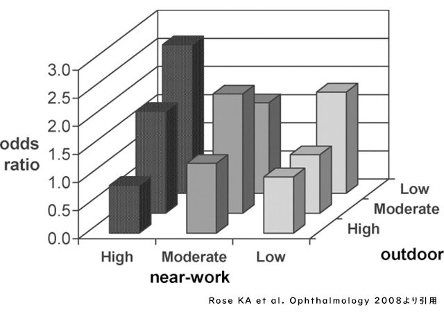 近業が多い、屋外活動が少ないのいずれかであれば近視のリスクはそれほどではありませんが、両方が揃うと近視のリスクは激増します。