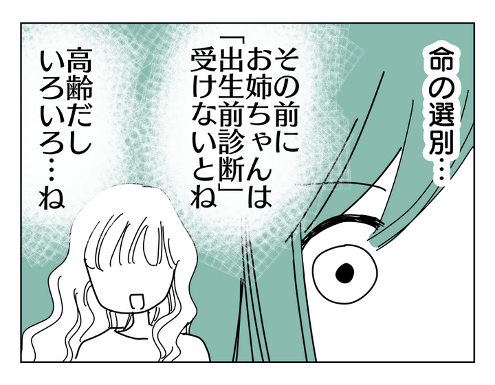私(キョウカ)は、両親と5歳年下の妹のミカコとの4人家族でした。妹が生まれてからずっと、私は親から「お姉ちゃん」としての役割を背負わされ、我慢を強いられたのです。「お姉ちゃんなんだから」母からの言葉は、まるで呪いでした。しかしそんなミカコとの関係性も、大人になるにつれ「姉と妹」から「大人同士」に変わり、対等に付き合えるように。そうして月日は流れ、ミカコは2児の母になり、私も8歳年下のタクヤと結婚。さらに私の妊娠が判明したのですが、ミカコから「出生前診断を受けないとね」と言われてしまったのです。ミカコの悪気ない発言はいつものことだけど、お腹の赤ちゃんの命の選別を安易にされてしまったような気がして、私はミカコに嫌悪感を抱いたのでした。