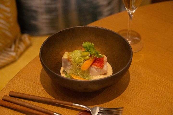 添えられているのは、春を感じさせる人参などの彩り豊かな野菜たち。旬の野菜の甘みと食感が、魚の味わいをより一層引き立てます。そして味の決め手となるのが、ベルモット(香草やスパイスを加えたワイン)をベースにしたノイリーソース。ほのかに苦みを感じるこのソースは、深いコクと香りがあり、金目鯛と春野菜を優しく包み込みます。