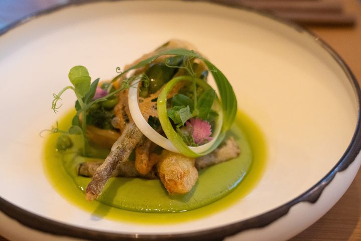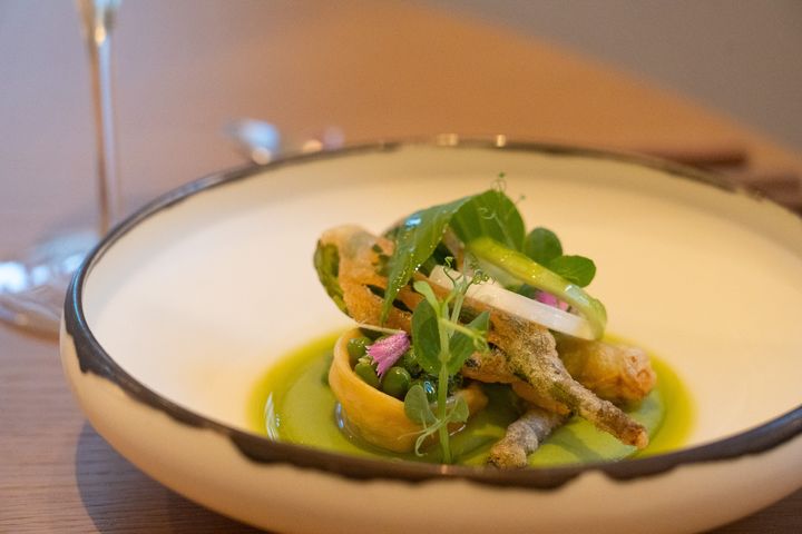次に運ばれてきたのは、春の香りを感じる「山菜ベニエ トルテリーニ レモンタイムオイル」。ふんわりと揚げられた山菜のベニエは驚くほど軽やかな食感で、口に入れるとサクッとほどけ、中から山菜特有のほろ苦さが顔を出します。中でも、上にちょこんと乗っている、くるんとした見た目が特徴的な「ルイ」は特に印象的で、シャキッとした歯ごたえと香りがアクセントになっていました。