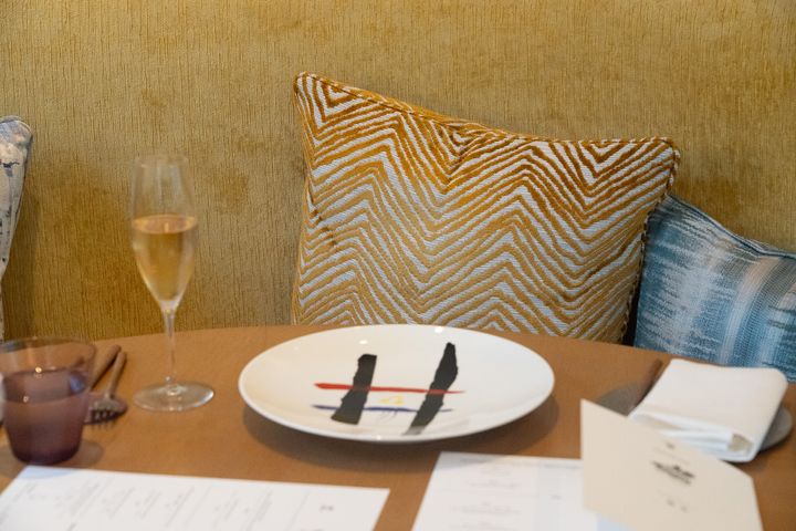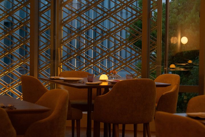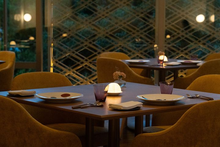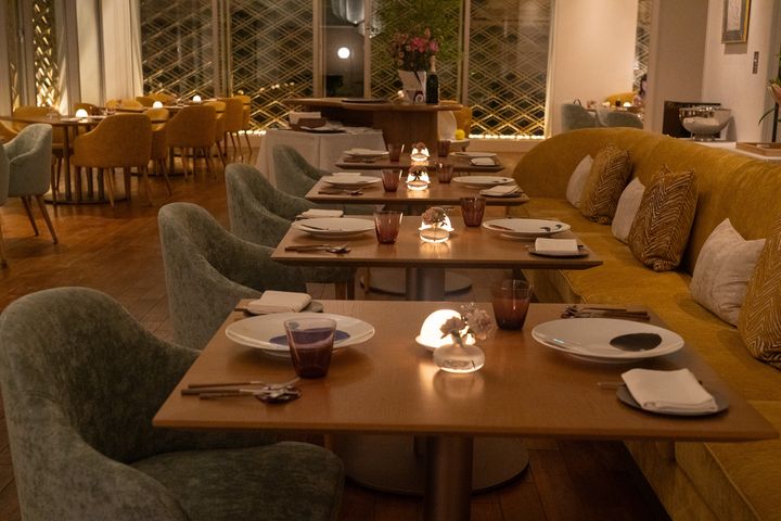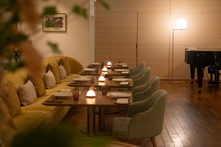 インテリアには、上質な木材が惜しみなく使われており、木のぬくもりが空間全体をやさしく包み込みます。ベージュやイエロー、淡い浅葱色を基調とした色使いが、キャンドルのように控えめな照明と絶妙に調和していて、ゲストの表情やお皿の上の料理が一層美しく引き立ちます。テーブル同士の間隔もゆったりと設計されており、ほどよい距離感が保たれているので、どの席にいても自然と声のトーンが落ち着いてくるような心地よさがあります。