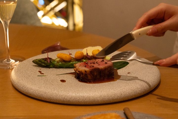 続いて登場した魚料理は、「金目鯛 春野菜 ノイリーソース」。分厚い金目鯛は“バプール”という蒸し調理法で仕上げられており、ふんわりと柔らかく、上品な旨味が口の中に広がります。絶妙な火入れによって、金目鯛本来の繊細な味わいが引き出されており、そのしっとりとした質感も魅力のひとつ。